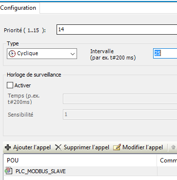 Nous allons paramétrer ces tâches pour qu'elles évoluent toutes les 25ms avec une priorité de 14 (voir le tableau des priorités de tâches dans l'article suivant) et qu'elles appellent nos programmes PLC_MODBUS_MASTER et PLC_MODBUS_SLAVE.