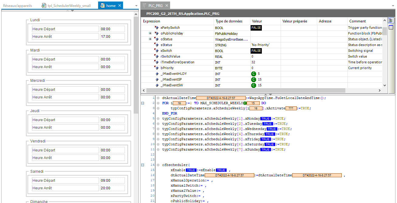 PROGRAM PLC_PRGVAR ofbscheduler:WagoAppScheduler.FbScheduler; xEnable: BOOL; dtActualDateTime: DATE_AND_TIME; typConfigParameters: WagoAppScheduler.typScheduler; i:int;END_VAR
