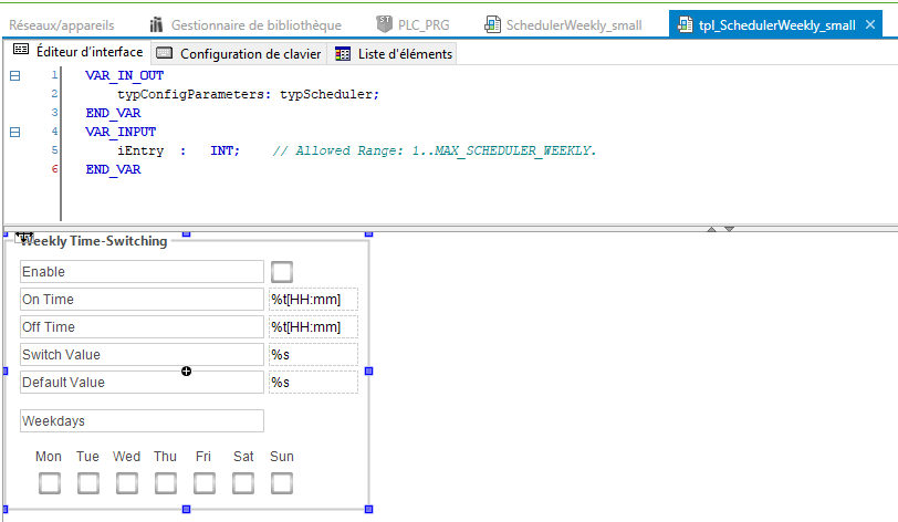 PROGRAM PLC_PRGVAR ofbscheduler:WagoAppScheduler.FbScheduler; xEnable: BOOL; dtActualDateTime: DATE_AND_TIME; typConfigParameters: WagoAppScheduler.typScheduler;END_VAR